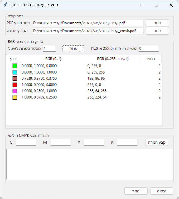 תוכנה זעירה (ניידת) הסורקת את קובץ ה-PDF ונותנת רשימה של כל צבעי ה-RGB שבמסמך, ובאפשרותנו להגדיר לכל צבע בנפרד לאיזה ערך צבע של CMYK אנו רוצים להמירו.